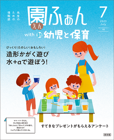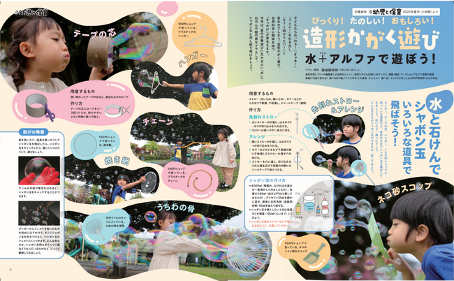 6月発行号<7月号>巻頭特集では、小学館発行「新 幼児と保育」の協力を得て“水+αで遊ぼう!”をテーマにさまざまな道具を使ったシャボン玉遊びや絵の具を混ぜた流し絵制作を掲載。工作に使う材料や作り方なども、写真や絵で分かりやすく紹介しました。子どもたちが簡単に取り組めるように、手順や上手くつくれるアイデアは、先生からも喜びの声が集まりました。