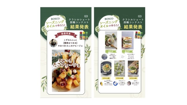 「BOSCO シーズニングオイル」のプロモーションとして、「クラシルショート イベントタイアップ」を用いて、「シーズニングオイルで作ろう」イベントを実施しました。