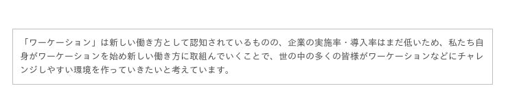 多くの企業がテレワークが推進される中で、孤独の発生・繋がりが欠如しているということが叫ばれています。それを、ワーケーションという形で、リアルで会って、現地で一緒に仕事をしながら、寝食を共にし、思い出作ることで、共に働く人との繋がりを創出し、企業としての文化醸成に寄与することが可能であると考えます。