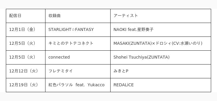 2023年12月は、「キミとのテトテコネクト / MASAKI(ZUNTATA)×ドロシィ(CV:水瀬いのり)」、「STARLIGHT☆FANTASY / NAOKI feat.星野奏子」など『テトテコネクト』の人気オリジナル楽曲5曲が追加されます。