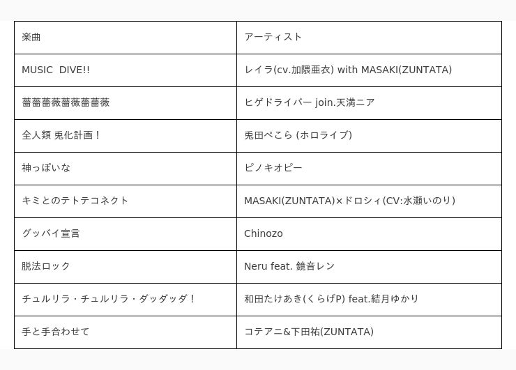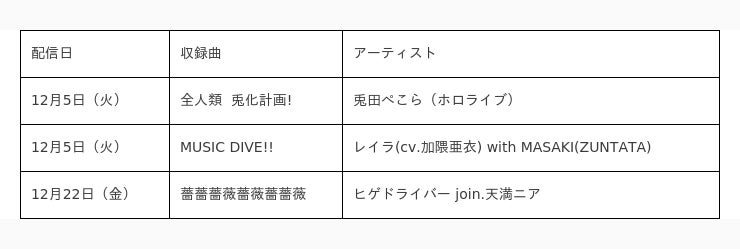 2023年12月は、『MUSIC DIVER』コラボとして、オリジナル楽曲「MUSIC DIVE!! / レイラ(cv.加隈亜衣) with MASAKI(ZUNTATA)」、「薔薔薔薇薔薇薔薔薇 / ヒゲドライバー join.天満ニア」、の2曲を含む全3曲が追加されます。