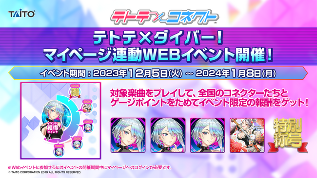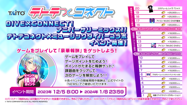 株式会社タイトー(本社:東京都新宿区)は、アーケード用音楽体感演奏ゲーム『MUSIC DIVER』の稼働1周年と、アーケード用リズムアクションゲーム『テトテコネクト』の稼働2周年を記念し、コラボイベントを開催します。