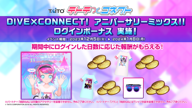 期間中にログインした日数に応じて、アクセサリー「テトテコネクトアニバーサリーメガネ」や、衣装「テトテコネクトアニバーサリーTシャツ」などを獲得することができます。