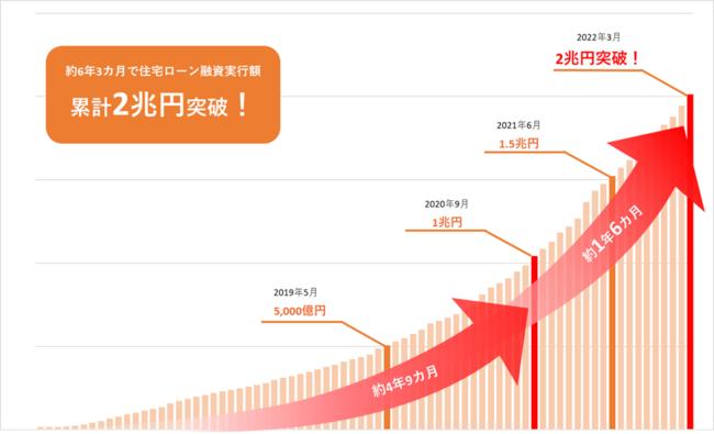 2015年12月に住宅ローンの提供を開始して以降、累計実行額は約6年3カ月で2兆円を突破し、インターネット専業銀行として最速での達成(※1)となりました。2020年9月に1兆円に到達してから約1年6カ月で実行額が2倍となり、これはサービス提供開始から1兆円に到達するまでの期間と比較して、3倍以上のスピードとなります。