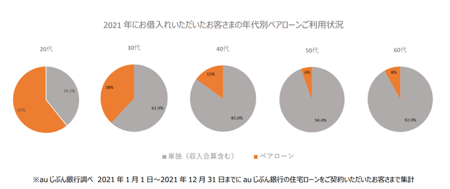 また、2021年にお借入れいただいたお客さまの年代別のペアローンの利用状況は、20代のお客さまが61%、30代のお客さまが38%となっており、特に若い世代を中心にご利用が多くなっています。