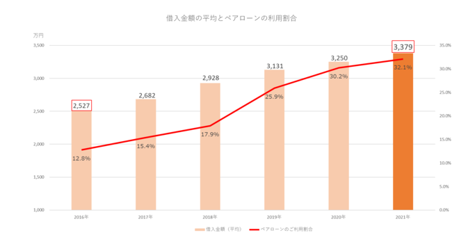 近年のお借入れ状況としては、2016年から2021年にかけて借入金額の平均が約2,527万円から約3,379万円まで増加しており、並行してペアローンをご利用いただく割合も増加しています。