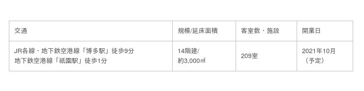 本案件地は、JR各線、新幹線、地下鉄空港線などが乗り入れる「博多」駅から徒歩9分、地下鉄空港線「祇園」駅より徒歩1分の駅前立地となり、アパホテル〈博多祇園駅前〉として、2021年10月の開業を予定している。本案件の概要は下記の通りとなる。