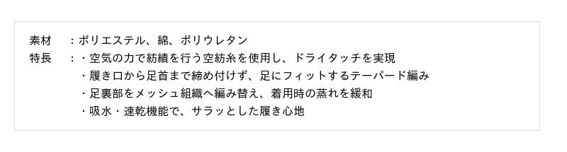 『締め付けないドライソックス クルー丈(SL-C601G/C601B)』は、ドライなタッチ感が特長の空紡糸を使用し、夏場でも快適に着用できる靴下です。履き口から足首にかけては締め付け感が少ないテーパード編みを採用し、足にやさしくフィット。足裏部分はメッシュ組織に編み替えることで、着用時の蒸れを軽減。吸水性・速乾性にも優れ、履いている間もサラッとしたドライな履き心地が続きます。