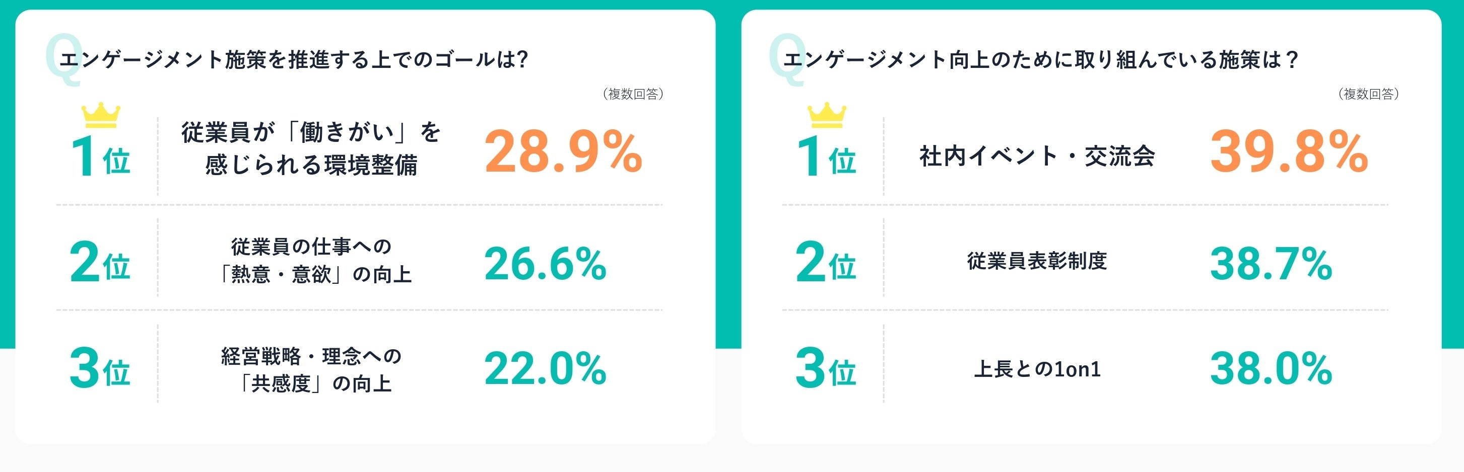 また、実施施策としては「社内イベント・交流会」「従業員表彰制度」「上長との1on1」など、対話を促す取り組みが多く挙げられています。
