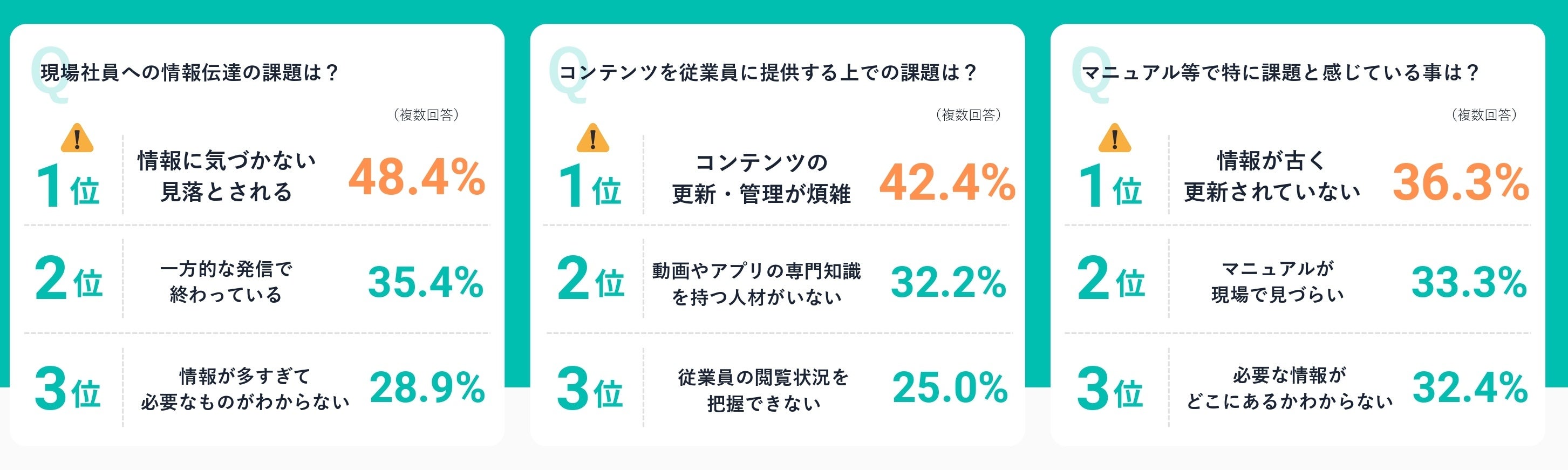 特にPCを持たない現場社員においては「情報にアクセスする手段がない」という物理的障壁が存在し、情報伝達の課題として、