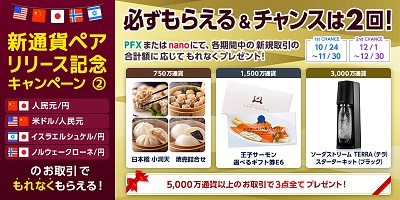 キャンペーン期間中に『パートナーズFX』および『パートナーズFXnano』における「人民元/円」「米ドル/人民元 ※」「イスラエルシュケル/円」「ノルウェークローネ/円」の新規取引の合計額に応じて、上記4通貨ペアの国にちなんだ賞品をプレゼントいたします。詳細は以下のページでご確認ください。