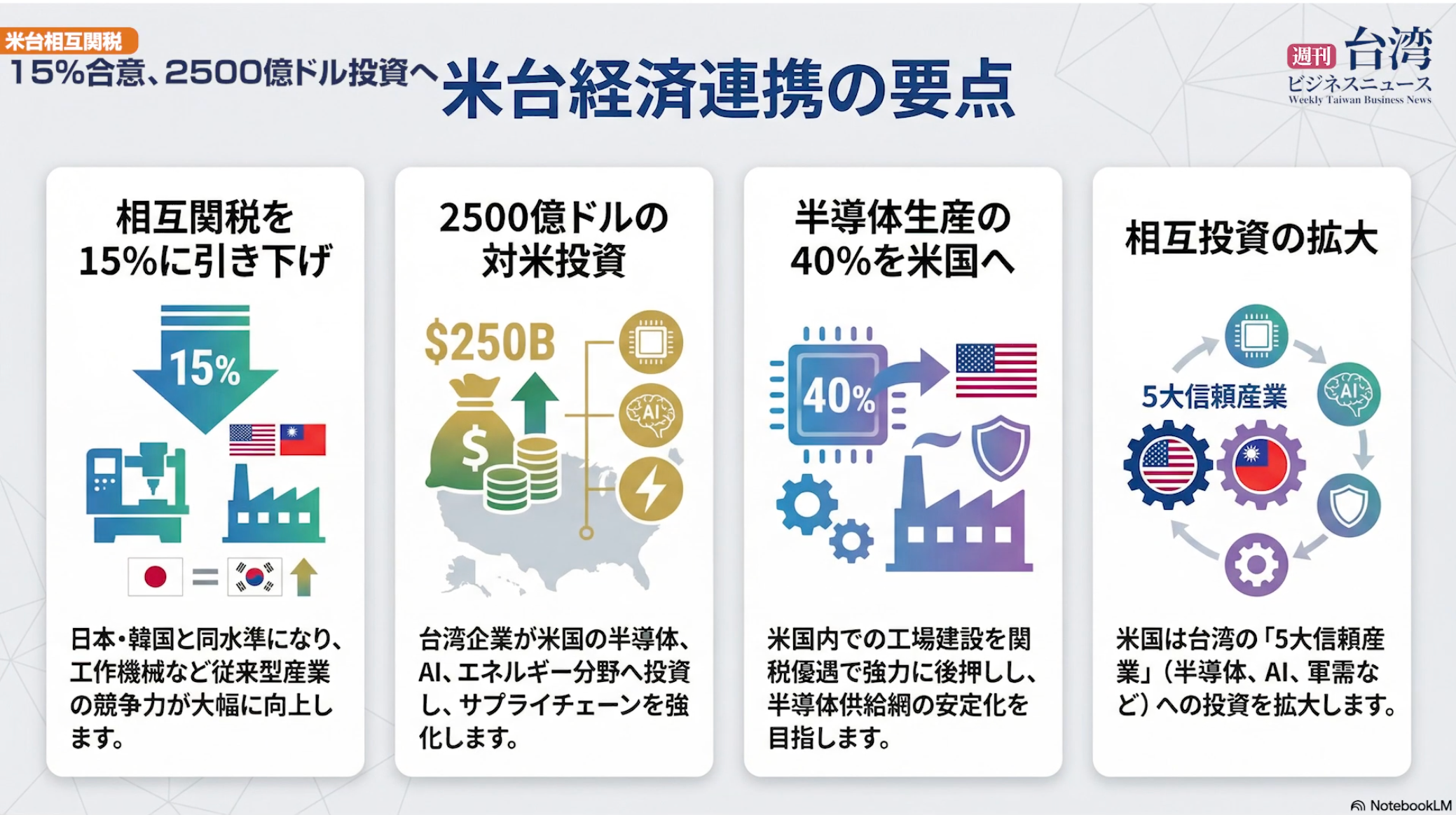 【トップニュース】米台関税交渉が合意、台湾企業は2,500億ドルを対米投資へ
