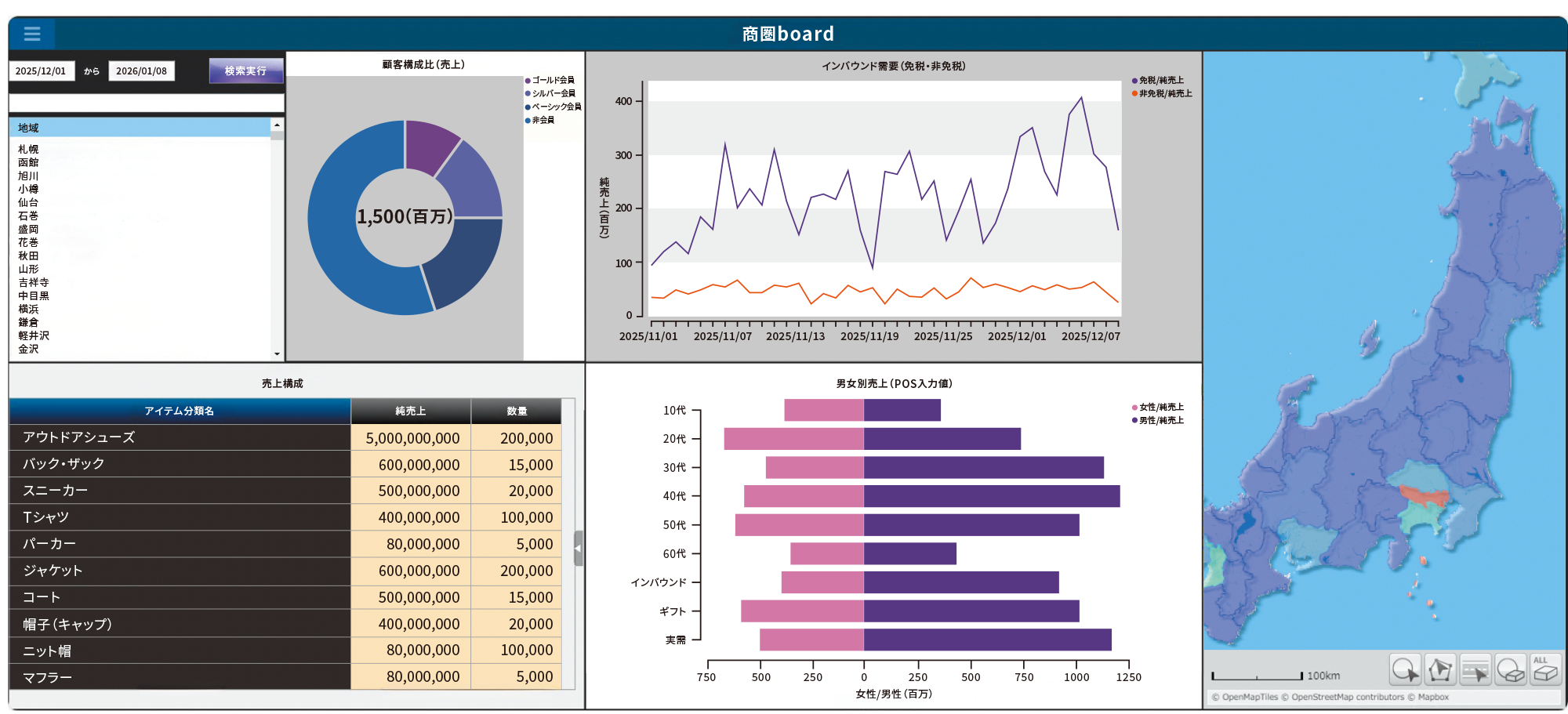 商圏分析ダッシュボード:顧客構成比・インバウンド需要・売上構成・男女別売上のほか地図機能により店舗別売上構成と商圏の進捗を可視化。※画像はダミーデータを利用