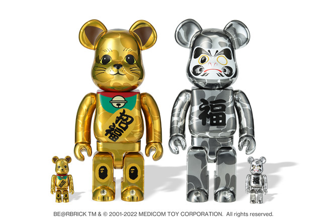 今回発売されるのはゴールドとシルバーを全身にまとったカラーリングで、新春に相応しい華やかなデザインで、それぞれの BE@RBRICK のボディには、BAPE(R) CAMO が全面にプリントされており、遊び心溢れたアイテムに仕上がっています。新年の招福祈願や祈願成就の縁起物としても、コレクターズアイテムとしてもおススメです。