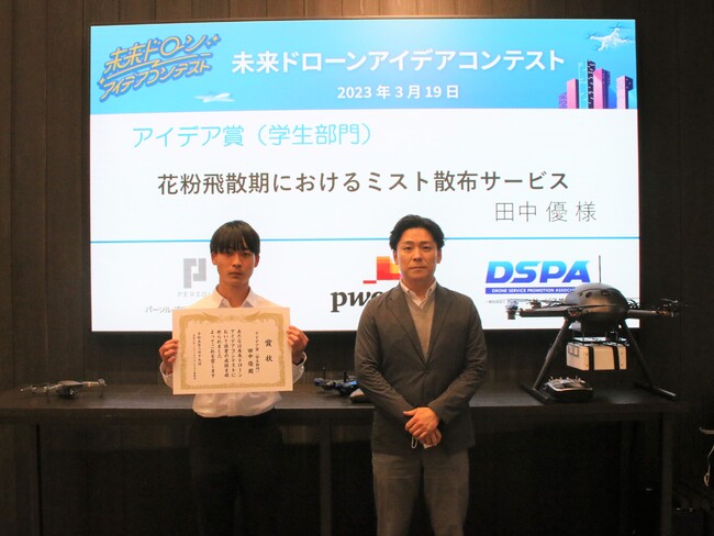 ドローン活用が進む医療と林業の領域において、花粉症の発生時対策ではなく、予防対策にドローンを用いることで、環境と健康の両面にポジティブな影響を与える可能性がある。この点から、ユニークなアイデアと評価しアイデア賞(学生部門)を授与する。
