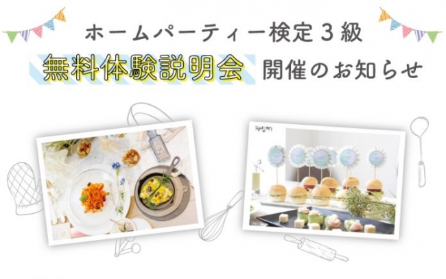 ホームパーティー検定の受験を検討されている方から「課題に挑戦しようと思ったけれど、ホームパーティーの開き方がわからない」「どんなパーティーを開いたらいいのかわからない」などのお悩みも伺っており、そんな方々のために実際にホームパーティー2級以上の講座でレクチャーしているホームパーティーフードやパーティーデコレーションレッスンのミニ体験会を実施、体験会で撮影した写真を3級の課題として提出頂き、合格となった方は、3級検定登録料3,000円を体験会参加者に限り無料となります。また、「ホームパーティー検定ってどんなことに役立つの?」というご質問にお答えする、説明会も実施致します。