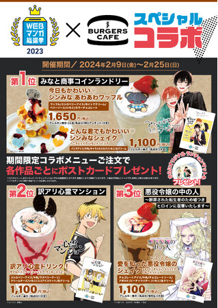 J.S. BURGERS CAFE、J.S. FOODIESの一部店舗にて、「WEBマンガ総選挙2023」上位3作品をイメージした特別メニューを販売いたします。コラボメニューをご注文いただいた方に、各作品ごとのオリジナルポストカードや「WEBマンガ総選挙2023」限定デザインのランチョンマットをプレゼントいたします。