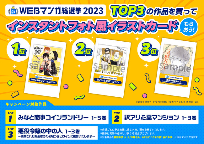 全国書店約630店舗にて上位10作品を一挙に紹介するフェアを開催します。合わせて一部の対象店舗では上位3作品を購入した方に「WEBマンガ総選挙2023」受賞記念インスタントフォト風イラストカードを配布します。