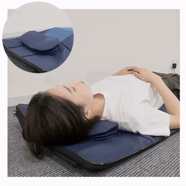 bonbone 胸椎ストレッチングマットは、空気の力を利用して筋肉や関節をほぐすマットです。『首2、肩2、背中1、腰2』の7箇所にエアバッグを配置し、自分では動かしにくい胸椎を、空気の力で簡単にストレッチできます。ストレッチ内容はリモコンで簡単に切り替え可能です。気になる箇所に合わせて時間やコースを調整してご利用いただけます。