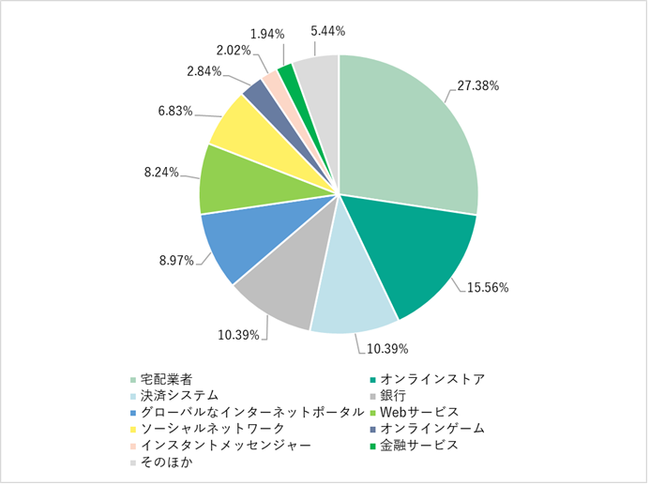 図1:Kasperskyフィッシング対策システムがアクセスを防いだ偽ページのカテゴリ別割合(2022年)