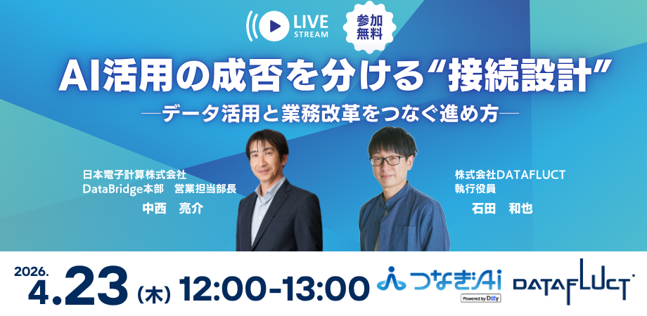 株式会社DATAFLUCT(本社所在地:東京都渋谷区、代表取締役CEO:久米村 隼人、以下DATAFLUCT)は、日本電子計算株式会社と共同で、無料オンラインセミナー「AI活用の成否を分ける“接続設計” データ活用と業務改革をつなぐ進め方」を、2026年4月23日 (木)12:00より開催します。