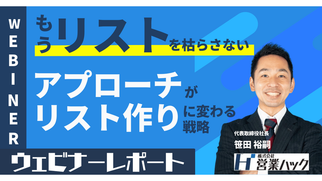 営業代行を通して営業支援を行う株式会社営業ハック(本社:東京都港区・代表:笹田裕嗣)がウェビナーを行いました。日時は2023年11月21日(火) 12:00〜13:00、参加費は無料。