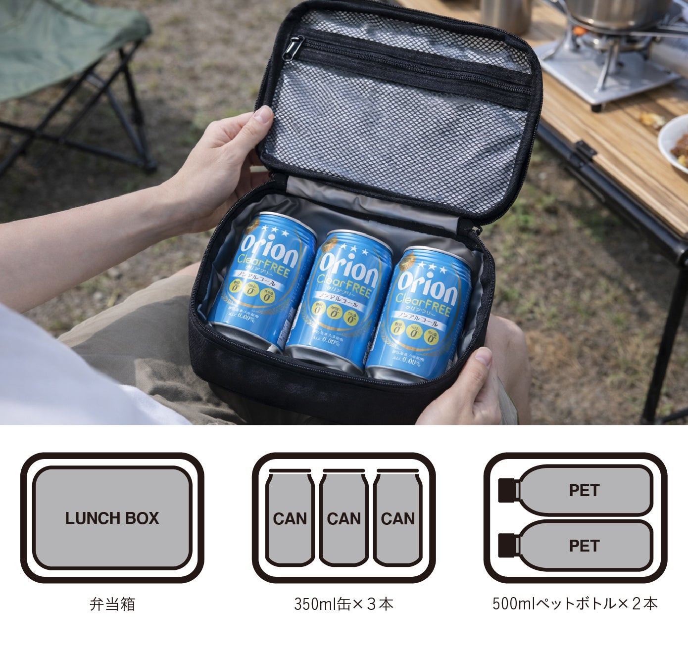 お弁当箱はもちろん、350ml缶なら3本、500mlペットボトルなら2本が収納可能。