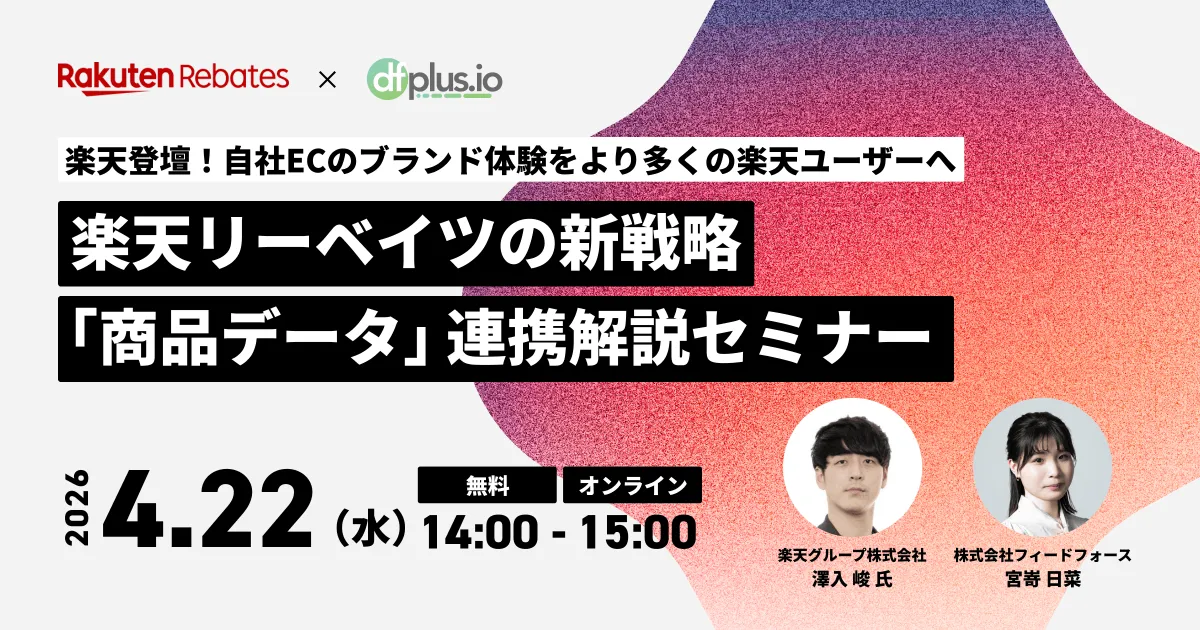 株式会社フィードフォース(所在地:東京都港区、代表取締役:塚田 耕司、以下「フィードフォース」)が提供する、マーケターのためのデータフィード管理ツール「dfplus.io」は、無料オンラインセミナー「楽天登壇!自社 EC のブランド体験をより多くの楽天ユーザーへ。楽天リーベイツの新戦略『商品データ連携』解説セミナー」を 2026 年 4 月 22 日(水)に開催いたします。