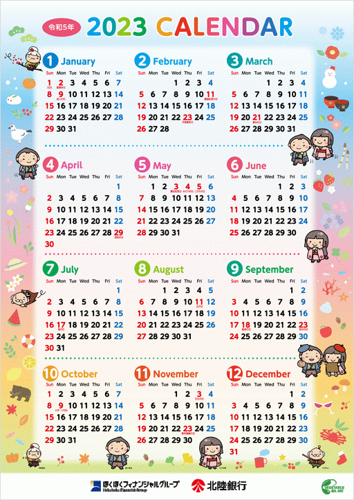 キャラクターカレンダーは、四季のイラストとキャラクターたちの中に、富山県・石川県・福井県・北海道をイメージしたイラストをさりげなくあしらった楽しい作品です。