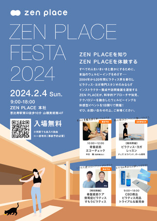 ウェルビーイング創造のリーディングカンパニーであるZEN PLACE(本社:東京都渋谷区 代表取締役:尾崎成彦)は、すべての人をいきいきと豊かにするために、本当のウェルビーイングをめざし2004年から20年間ピラティス界を牽引し、ピラティス・ヨガ専門スタジオのみならず、インストラクター養成コースや訪問看護ステーションなどを運営しています。そのノウハウを生かした科学的アプローチや知見、テクノロジーを融合したウェルビーイングな体験型イベント『ZEN PLACE FESTA 2024 』を1日限定で東京・恵比寿にて2024年2月4日(日)9:00〜18:00に開催いたします。