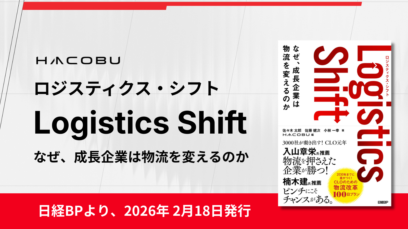 データの力で物流課題を解決する株式会社Hacobuは、書籍『Logistics Shift(ロジスティクス・シフト)〜なぜ、成長企業は物流を変えるのか』を2026年2月18日に日経BPより発行します。