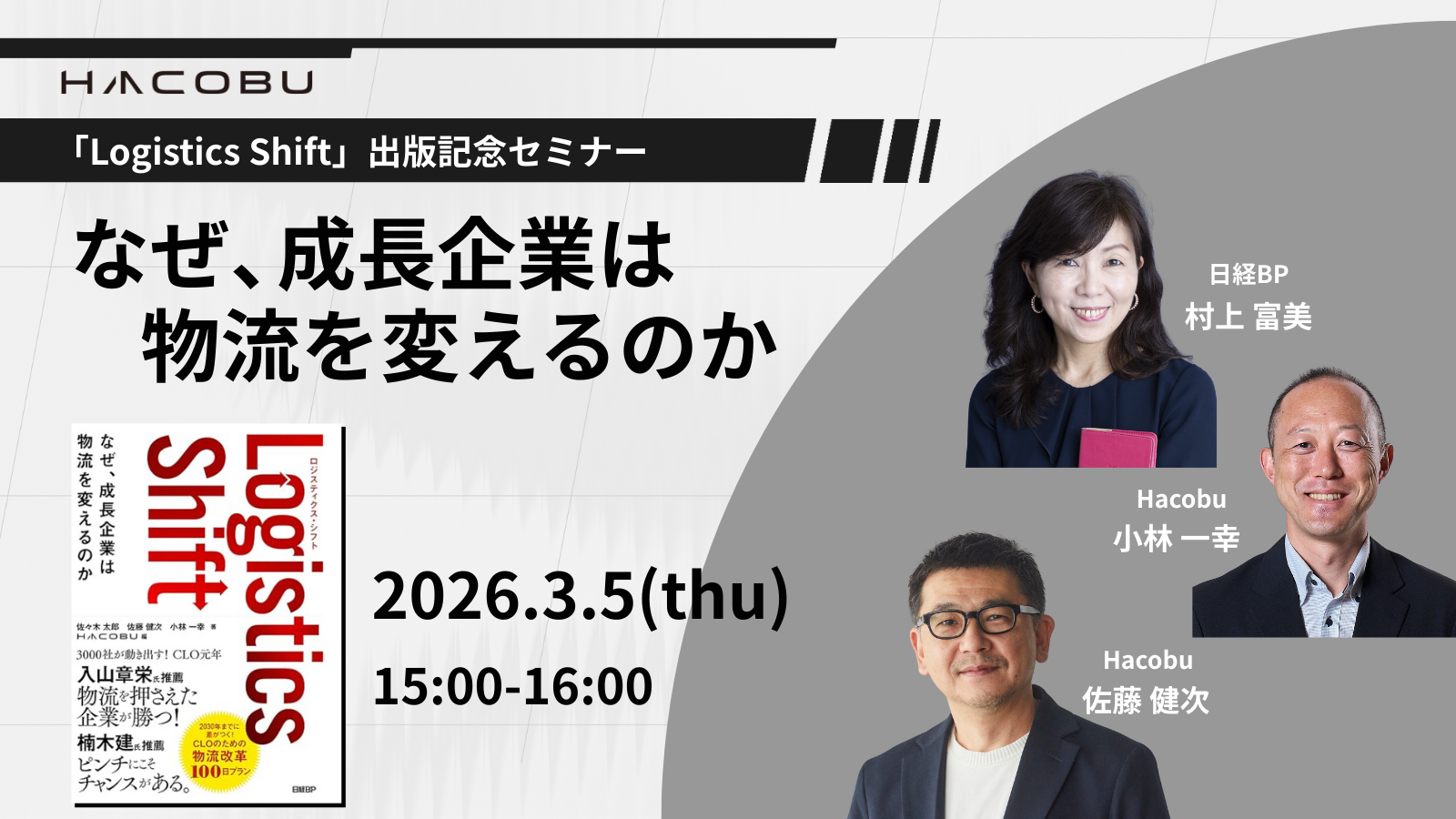 本書出版を記念して、書籍の内容をダイジェスト形式でお届けするWebセミナーを開催します。著者のHacobu佐藤・小林に加え、本書の編集を担当した日経BP 村上富美氏も登壇します。村上氏は、フィジカルインターネット実現会議の委員を務めるなど、長年にわたり物流の最前線を追ってきました。当日は、本書に込めた思いを語っていただきます。