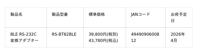 ラトックシステム株式会社(本社:大阪市西区、代表取締役社長:近藤 正和、以下ラトックシステム)は、iOS端末からシリアル機器をBLE経由で制御できる、開発者向け変換アダプター「RS-BT62BLE」を2026年4月より出荷開始いたします。