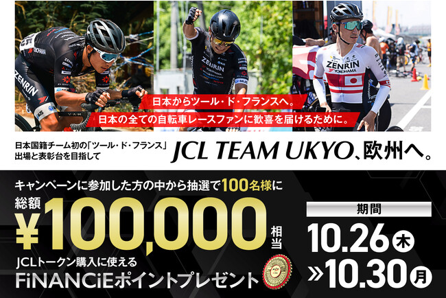JCLの欧州拠点設立を記念して、JCLトークンの購入に使える「総額100,000円相当」のFiNANCiEポイントが【抽選で100名様】に当たるJCL TEAM UKYO 応援キャンペーンを実施します。