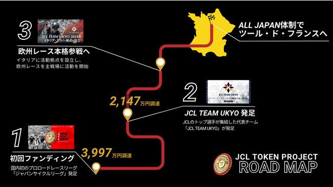 2022年1月に「FiNANCiE」においてプロジェクトを立ち上げて以降、トークン発行型ファンディングにより6,139万円(計2回)の資金調達に成功し、共創型コミュニティと共に活動してきました。2023年1月には、日本トップクラスの選手が集結した「JCL TEAM UKYO」を発足し、リーグ発足当初からの理念である「日本国籍のチームとして史上初のツール・ド・フランス出場、そして表彰台に登る」という目標に向けて着実に歩みを進めています。