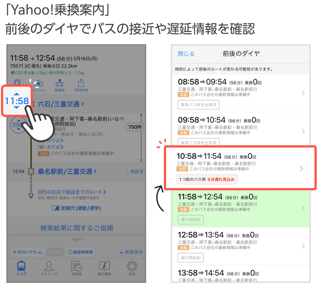 検索結果の発車時刻をタップすると、前後のダイヤが表示されます。乗車予定のバスの1つ前のバスが遅れている場合、そのバスに乗車できる可能性があります。