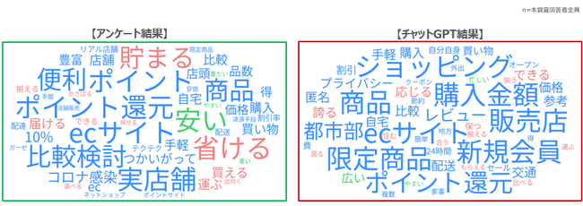 ECサイトで買い物をする理由は【アンケート】と【ChatGPT】共に、「ポイント還元」「実店舗(販売店)」「商品」などのワードが多くあげられており、「お得であること」「利便性」「使い勝手の良さ」などを重視されていることがわかる。一方で、【アンケート】では「コロナ」などの時事ネタに関するワードがあげられているが、 【ChatGPT】の方ではあげられていない。
