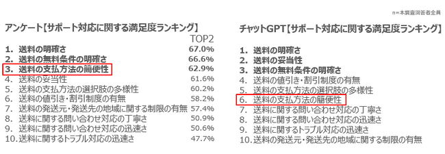 「配送」に関する項目別満足度ランキングは【アンケート】では、1位「配送の正確さ」2位「配送スピード」3位「商品の到着状態の良さ」となっている。【ChatGPT】では、1位 「商品の到着状態の良さ」2位「配送料金の妥当性」3位「追跡サービスの有無」となっているが、2位の「配送料金の妥当性」は、【アンケート】では9位となっており、大きな順位の違いが見られた。