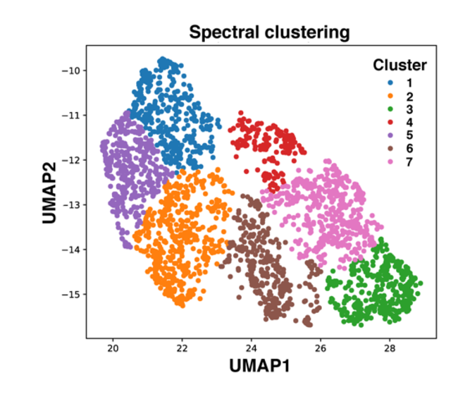 収集したデータを解析したところ、3,593名の研究参加者のうち、72.9%(2,619名)に症候性ドライアイを認めました。さらに、ドライアイの多様な症状を、次元削減アルゴリズムUMAPを用いて検証を行ったところ、7つのクラスターに層別化することに成功しました(図2)。
