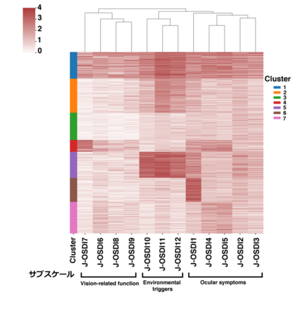 そして、階層型クラスタリングを用いて層別化された各クラスターのJ-OSDIの12項目のスコアを視覚化しました(図3)。例えば重症群であるクラスター1は全ての症状が悪く、クラスター5では環境因子に関連して症状が強いことがわかります。