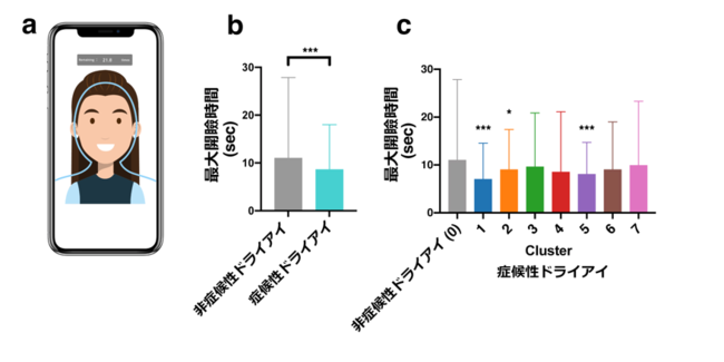 さらに各クラスターに対してドライアイリズムから収集した生体情報(最大開瞼時間:まばたきを我慢できる時間)を用いたデジタルフェノタイピングを実施しました(図4a)。症候性ドライアイではスマホアプリで測定した最大開瞼時間が短くなることがわかりました(図4b)。層別化された各クラスターにおいて特徴的な最大開瞼時間の変化を示しました(図4c)。このことから、スマホアプリでまばたきを計測することで、ドライアイのスクリーニングならびにドライアイのタイプを予測できる可能性があります。