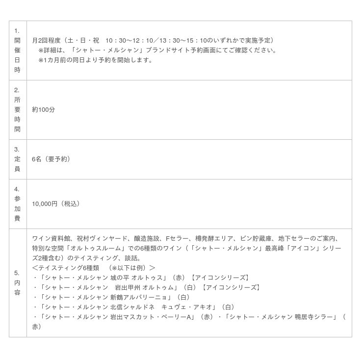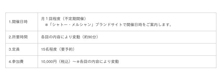 上記に加え、ワインメーカーによる各回こだわりのコンセプトや、バックヴィンテージ品を含む希少品などの比較テイスティングを通じて、「シャトー・メルシャン」ブランドをさらに深くご堪能いただける特別なセミナー。