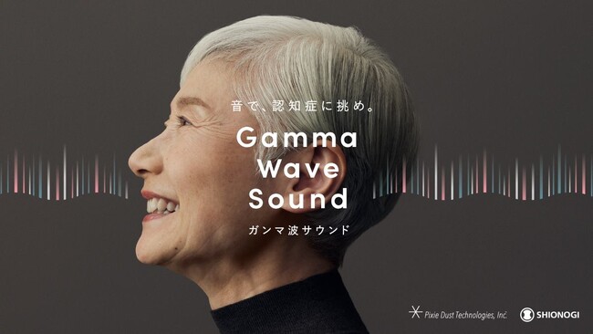 「ガンマ波サウンド」は、塩野義製薬とピクシーダストテクノロジーズが共同開発。ラジオやテレビなど、日常のあらゆる音をリアルタイムに40Hz変調を施す特殊な技術「ガンマ波変調技術」を用いることで、日常生活を送りながら認知機能をケアできる可能性がある音です。40Hzの周波数は、ヒトが記憶や推論などの問題解決型の思考をしているときに現れる脳波「ガンマ波」と同じ帯域であり、認知機能障害時には、脳内で認知機能を発揮するのに必要とされる脳の特定のリズム活動(ガンマ波)が低下していることが特徴の一つとして報告されています※1。40Hz周期の音の呈示によって、マウスの認知機能が改善した研究結果や、ヒトを対象とした臨床試験においても認知機能悪化の抑制や脳萎縮の抑制を示唆する研究結果が得られており、40Hz周期の音は世界的に注目をされています※2,3。