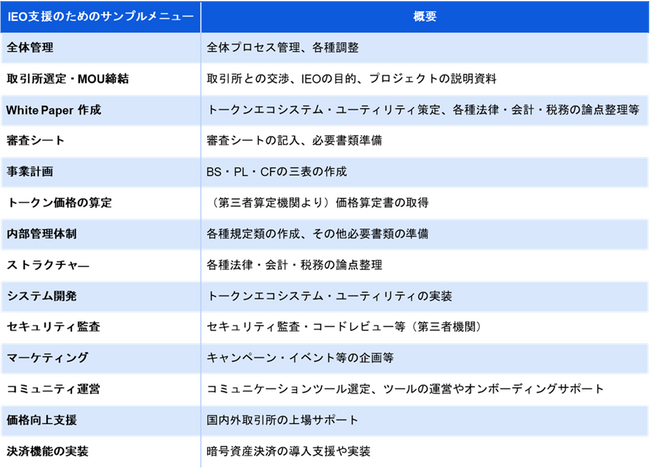 「IEO支援サービス」では、以下のメニューを組み合わせて提供します。