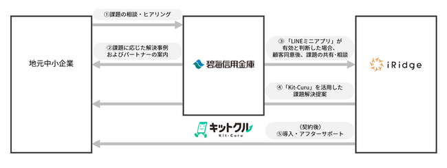 碧海信用金庫はデジタル戦略部を中心にアイリッジと連携し、「LINEミニアプリ」をはじめとするOMO(Online Merges with Offline=オンラインとオフラインの融合)およびデジタルマーケティング関連知識とデジタル支援スキルの向上を図ります。その上で、取引先企業への金融仲介やコンサルティング提供の中で浮かび上がった企業の課題に対し、「LINEミニアプリ」が有効であると判断できた場合に、「Kit-Curu」を活用した課題解決提案を行います。提案に際しては、取引先企業の同意のもと、アイリッジより「Kit-Curu」のデモンストレーションや導入効果の説明をし、顧客サポートを行います。