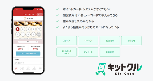 「Kit-Curu」は、自社でポイントシステムを導入することなく単体でCRM(顧客関係管理)や来店分析、集客施策を行える「LINEミニアプリ」の販促ツールで、月額5万円から利用可能です。店舗集客のきっかけとなるクーポンやスタンプカード、インスタントウィン(その場で当落がわかるタイプ)の抽選機能に加え、会員登録機能やアンケート、友達紹介機能などを搭載しています。クーポンやスタンプの利用状況、登録した属性情報、アンケートなどのデータをもとにセグメントを作成し、特定顧客限定クーポンや期間限定クーポン、枚数限定先着クーポンなどの発行も可能です。