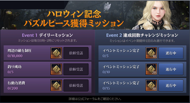 イベント期間中、各ミッションをクリアすると、イベントページより上記「ハロウィン記念パズルイベント」で使用する「パズルピース」を獲得することができます。