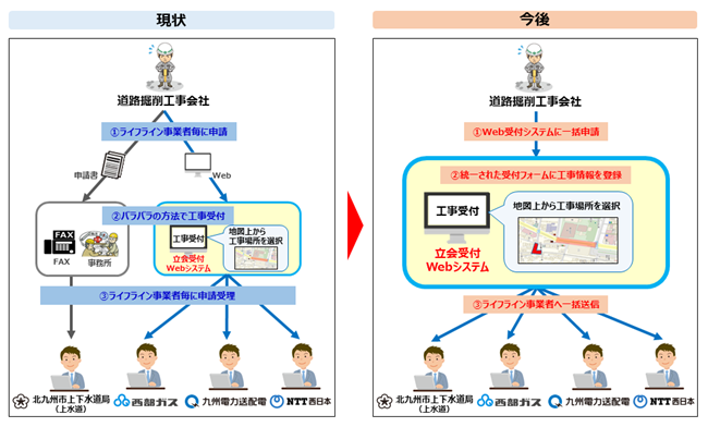 西部ガス、九州電力送配電およびNTT西日本は、本Webシステムを利用した共同受付により業務効率化や生産性向上を図っているところですが、新たに北九州市上下水道局が共同受付に加わることによって、更なる効果の最大化をめざします。