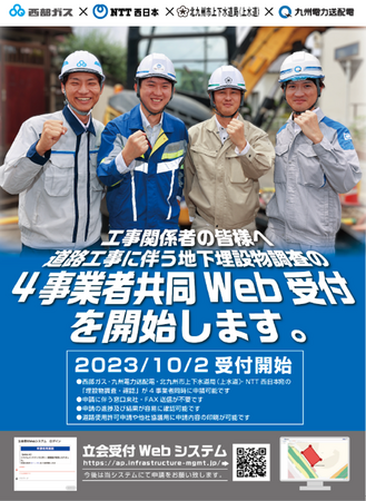 西部ガス株式会社(代表取締役社長:道永 幸典、以下西部ガス)、九州電力送配電株式会社(代表取締役社長:廣渡 健、以下九州電力送配電)、西日本電信電話株式会社(代表取締役社長:森林 正彰、以下NTT西日本)は、2023年4月3日から、立会受付Webシステム(以下、本Webシステム)を共同利用し、道路掘削工事を予定している工事会社等(以下、道路掘削工事会社)からの埋設物調査の共同受付※1を行っています。