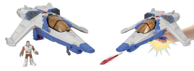 幅が約30cmもある大きなビークルと、バズのセットです。ビークル下部のボタンを押すとサウンドやライトとともにミサイルが発射されるので、映画さながらのバトルシーンを楽しむことができます。